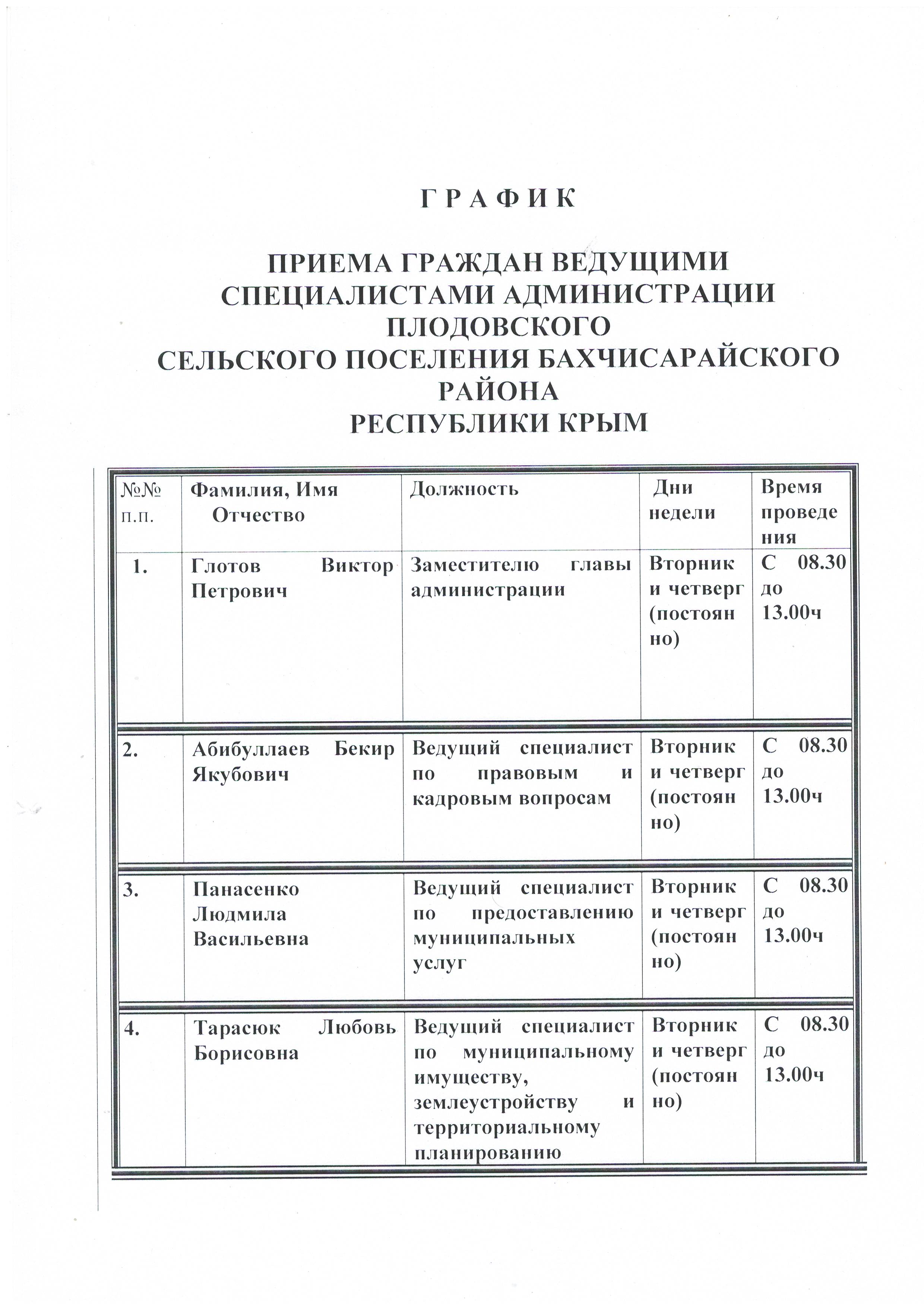 График приема граждан ведущими специалистами администрации Плодовского сельского поселения